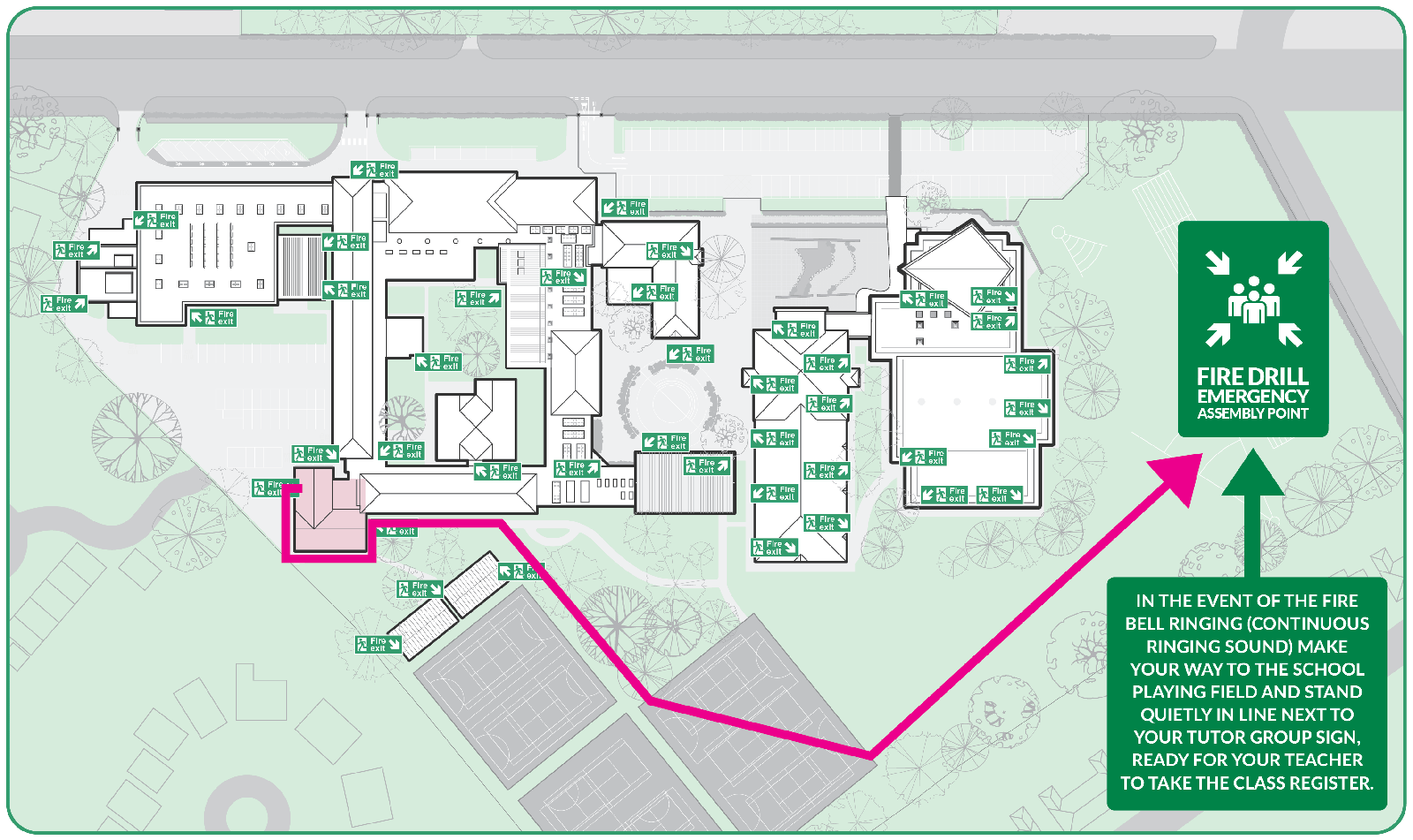 - Fire drill adjustment only applies to students exiting the MFL block and Science Huts who would usually then walk past the 2000 building and the netball courts in order to reach the designated area via the field. These students will now cross over the netball courts with staff supervision onto the field.