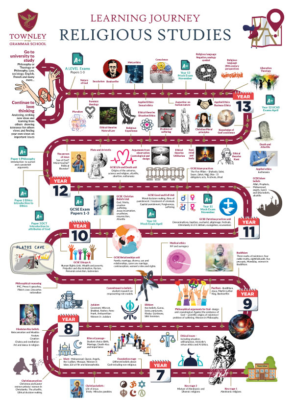 Religious Studies teaches about the main beliefs and practices of the different world religions and examines philosophical and ethical responses to issues. At Townley Grammar, by studying Religious Studies, individuals develop the ability to see another point of view and to understand what it means to be a member of a faith community. Students learn how a religious belief works and are able to identify the moral values which guide the lives of religious people. Religious Studies can help individuals to sort out their own ideas, values and commitments.